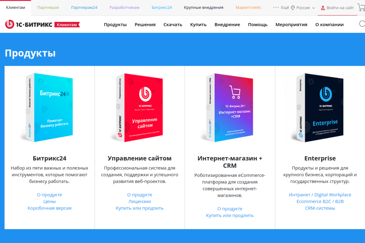 Всё необходимое для запуска и ведения бизнеса: CMS для создания сайтов и интернет-магазинов, конструктор сайтов и лендингов, корпоративный портал компании, CRM.