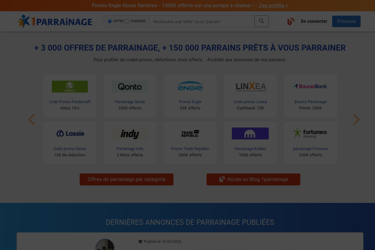 Site de parrainage n°1 en France avec 3000 offres promo / Cashback référencées et une communauté de plus de 120000 parrains, clients sur les marques, qui partagent leur code ou lien de parrainage dans leurs annonces publiées gratuitement.
