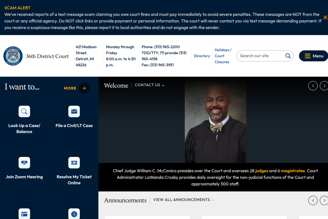 36thdistrictcourtmi.gov looks like law, government, & politics. Traffic signals point to roughly 58.5K monthly visits. Current AI trust scoring is 8/100.