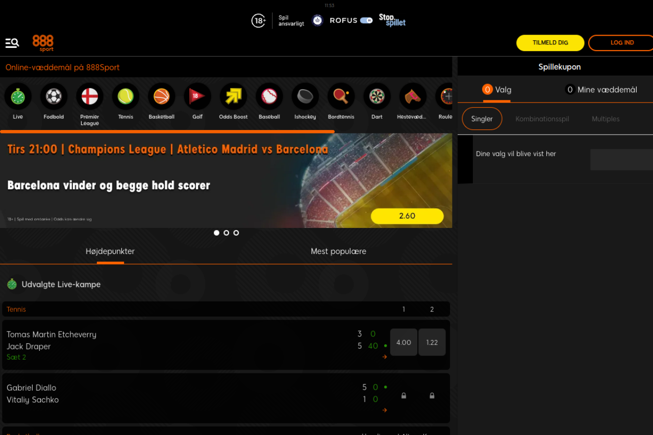 De mest attraktive odds på nettet. 888sport™ tilbyder et utal af odds fra de største sportsbegivenheder. Fodbold, håndbold, tennis eller basketball! Regler & Vilkår Gælder