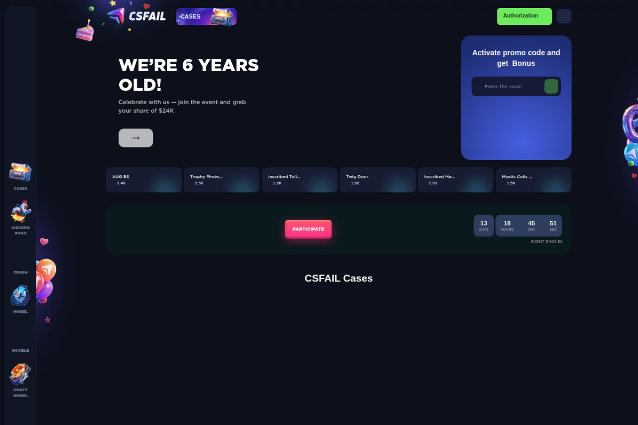 CSFAIL offers the ultimate Crash, Jackpot, Wheel, Double CS:GO experience. Daily giveaways, promo codes. Deposits via cards, qiwi, btc, eth, usdt