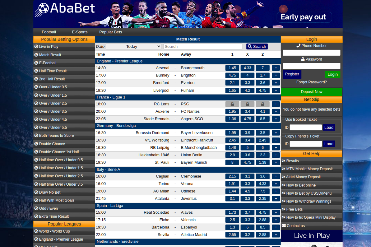 AbaBet is the best and easiest Online and Mobile Betting website in Uganda with the highest odds, Live betting, Bonuses, Free bets, and Free sure wins. The website is by far the fastest and easiest to use in Uganda. You can place bets on top leagues such as English premier league, Spanish Laliga, Italian Serie A, French League 1, UEFA Champions League, German Bundesliga, and many other leagues.