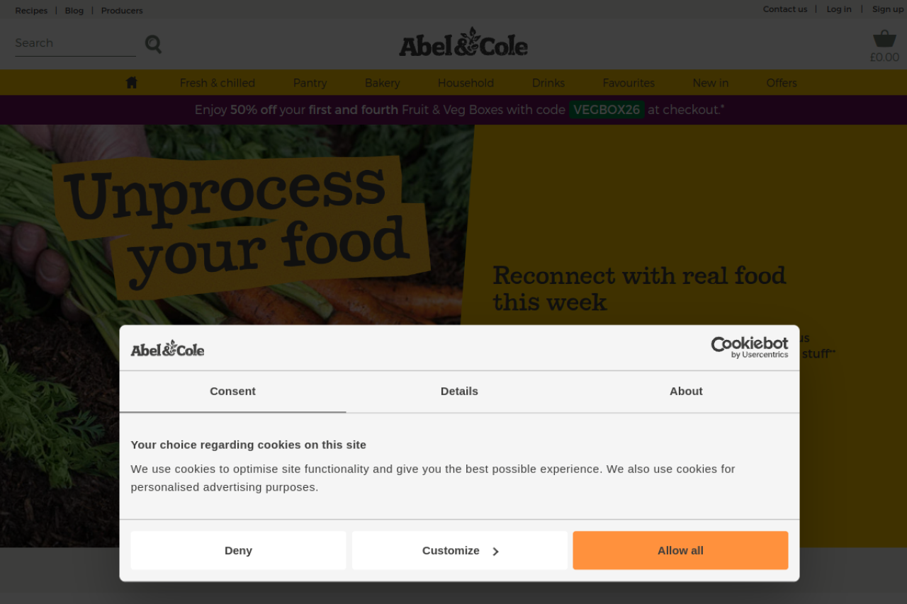 abelandcole.co.uk looks like food & drink. Traffic signals point to roughly 684.6K monthly visits. Current AI trust scoring is 8/100.