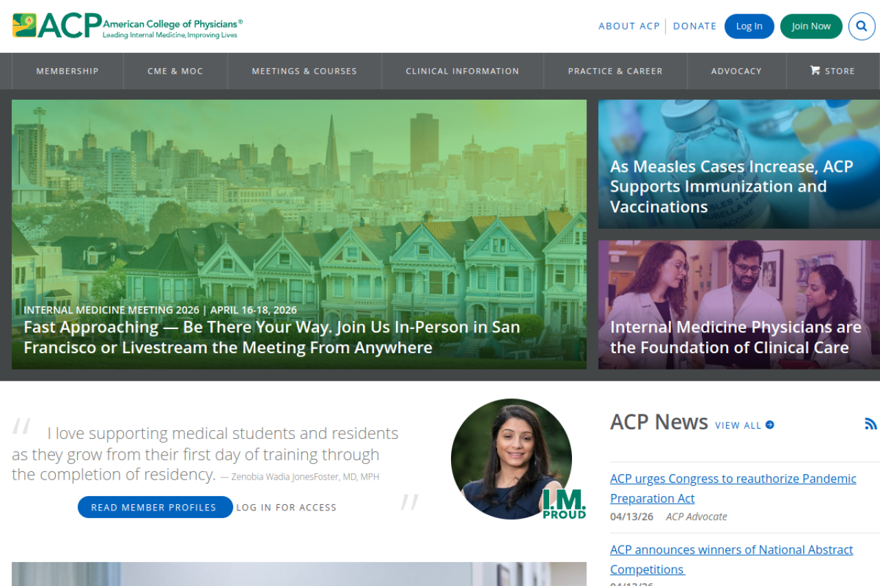 Official site of the American College of Physicians. ACP provides advocacy, practice tools, clinical guidance, CME and MOC for Internal Medicine and more.