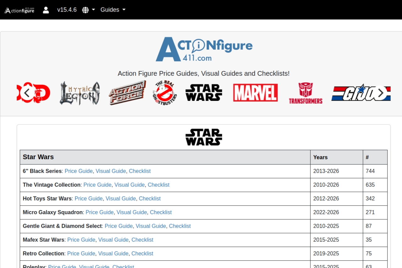 Action Figure Price Guides, Visual Guides and Checklists for Star Wars, Marvel, Transformers, G.I. Joe, Masters of the Universe, Teenage Mutant Ninja Turtles, Power Rangers, DC, Thundercats, Indiana Jones, Dungeons Dragons, Mythic Legions, Action Force and Ghostbusters action figures, vehicles and playsets.