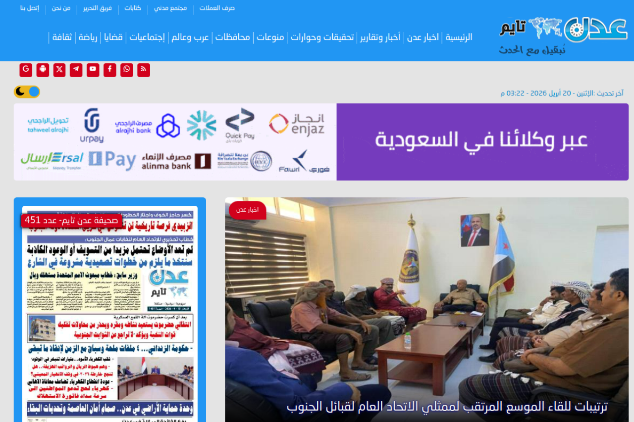 عدن تايم - صحيفة الكترونية تأسست في مدينة عدن في 14 أكتوبر 2015م ، يضم فريق التحرير نخبة من الصحفيين من المؤهلين جامعيا واكتسبوا خبرات في عدد من الصحف الرسمية والاهلية والدولية.