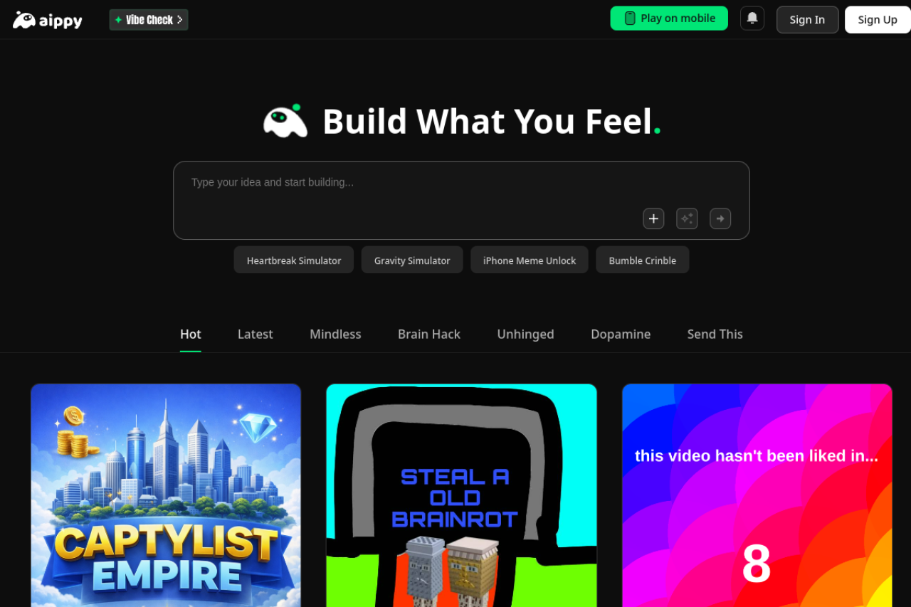 Aippy is a vibrant space to build, share, and explore interactive creations with AI. Simply describe your idea in natural language and watch it come alive, no coding required. From playful mini-games to interactive art and creative tools, Aippy makes it easy to create and share directly in your browser or app.