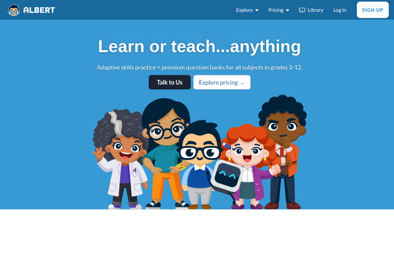 Albert offers teachers rigorous, standards-aligned practice content for grades 5-12 in ELA, math, science, social studies, Spanish, AP, ACT/SAT, and state exams.