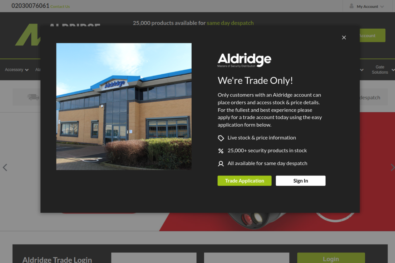 Aldridge Security - Masters Of Security Distribution. Aldridge is the largest trade only security wholesaler in the UK & Ireland and has over 65 years of experience in the industry. With over 16,000 different products in stock including 260 brands available from our London and Manchester branches, the Aldridge portfolio includes Access Control, Ironmongery, Hardware, Key Cutting, Locking Products, Locksmithing Tools & Accessories and Multipoint Locking (UPVC) products.