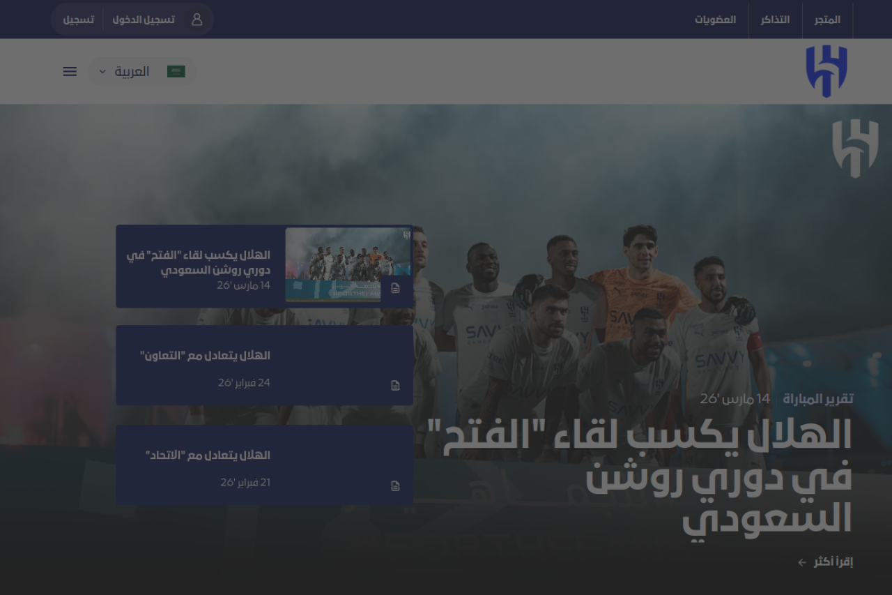 مرحبًا بكم في الموقع الرسمي لنادي الهلال السعودي. اكتشف آخر الأخبار، تحديثات المباريات، مقاطع الفيديو الحصرية، التذاكر، المتجر وتجارب المشجعين.