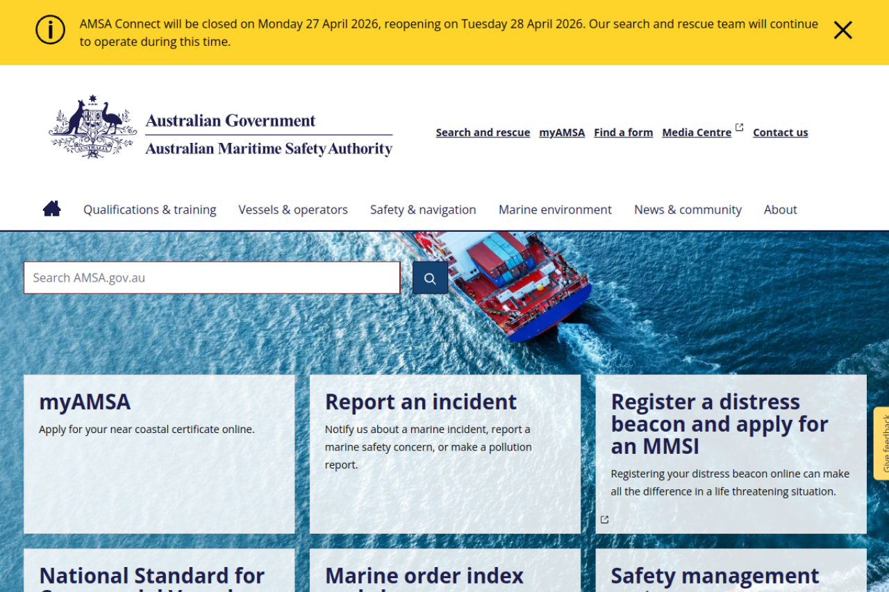 amsa.gov.au looks like government & politics. Traffic signals point to roughly 116.4K monthly visits. Current AI trust scoring is 5/100.