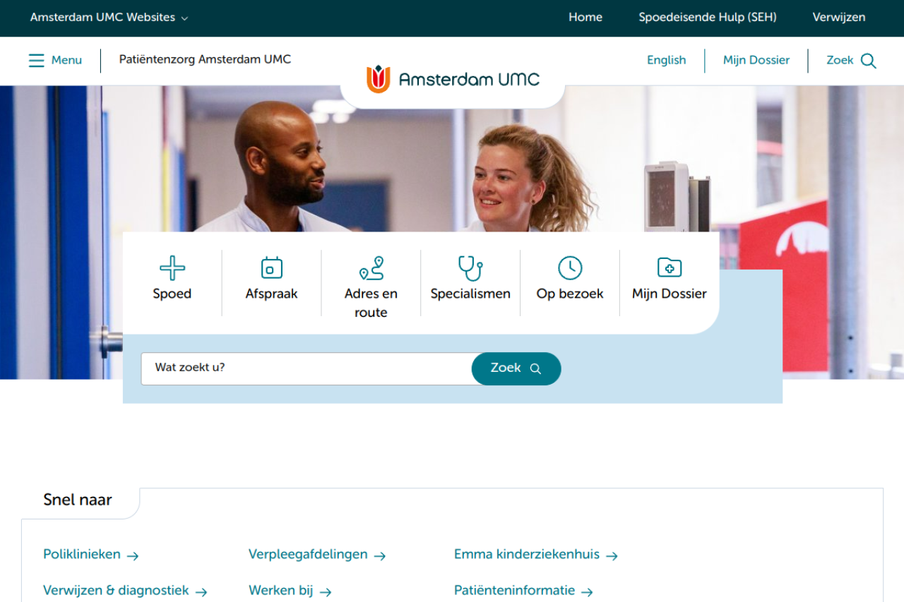 Academisch ziekenhuis Amsterdam UMC levert op locatie AMC en VUmc excellente zorg, innovatief onderzoek en opleiding voor zorgprofessionals van de toekomst.