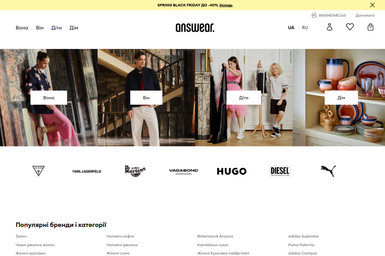 answear.ua looks like shopping. Traffic signals point to roughly 1.7M monthly visits. Current AI trust scoring is 15/100.