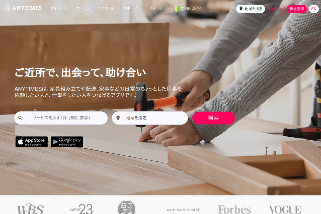 ANYTIMES(エニタイムズ)は、日常のちょっとした用事を依頼したい人と、 空き時間などに仕事をしたい人をつなげるスキルシェアサービスです。家の掃除から家具組み立て、料理代行、語学レッスンなど日常のちょっとしたことからスキルシェアが可能です。全国365日24時間対応可能。