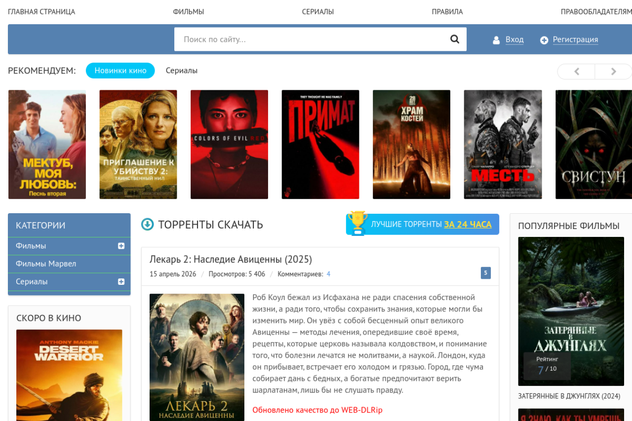 Торрент портал где вы можете скачать бесплатно, через торрент, фильмы и сериалы разных жанров, в хорошем качестве, без регистрации. Все самые популярные торренты только у нас!
