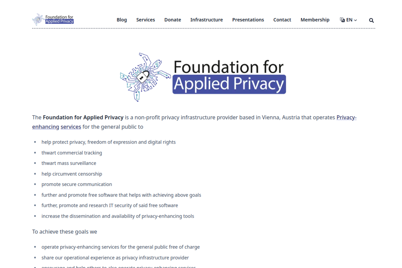 The Foundation for Applied Privacy is a non-profit privacy infrastructure provider based in Vienna, Austria that operates Privacy-enhancing services for the general public.