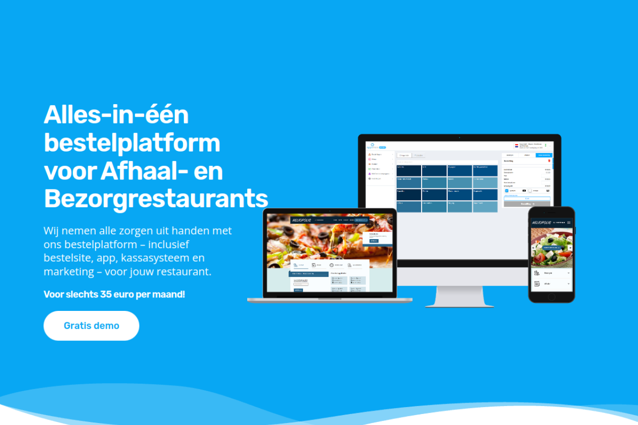 Hét totaalpakket voor afhaal- en bezorgrestaurants: een complete bestelsite & app, POS, kassasysteem voor slechts €35 per maand.