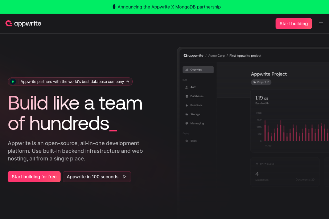 Appwrite is an open-source platform for building applications at any scale, using your preferred programming languages and tools.