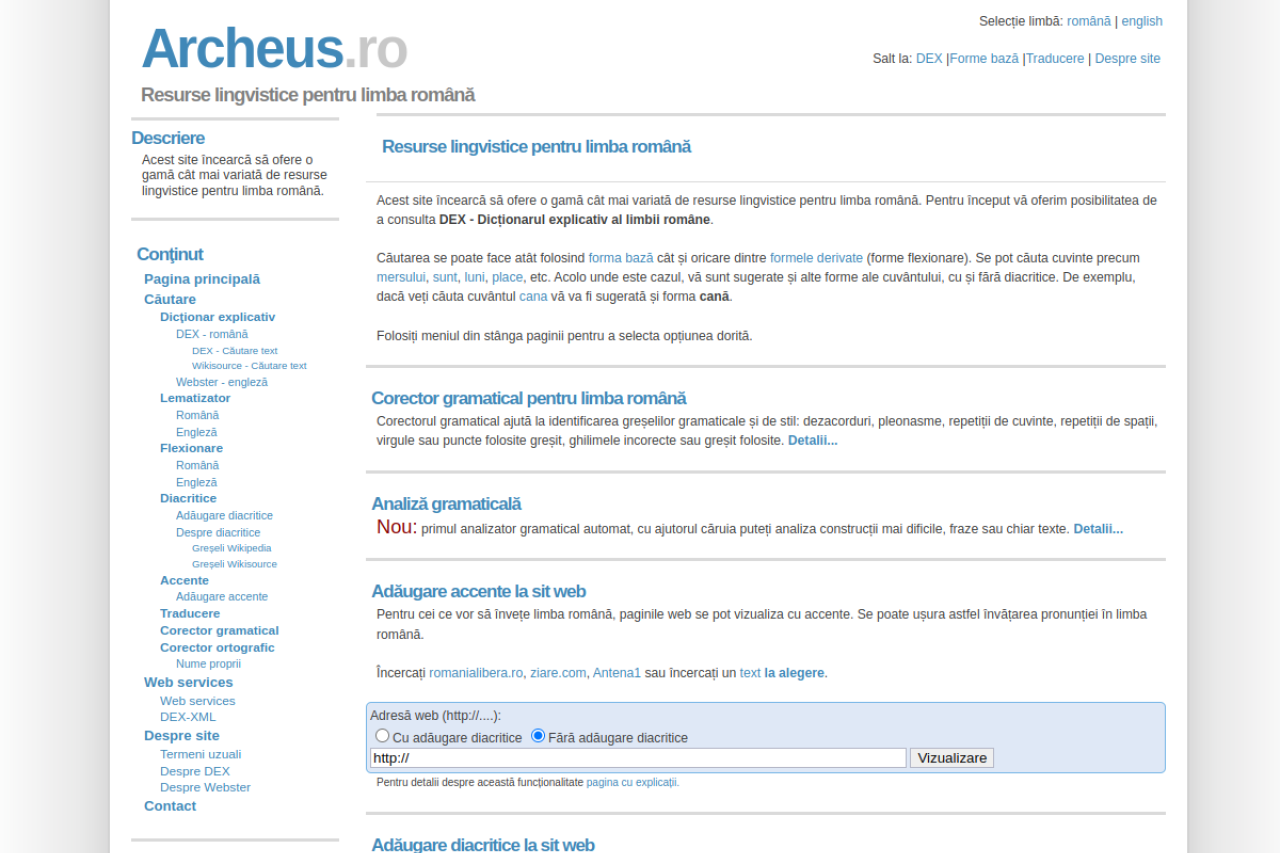 Consultare dictionare pentru limba romana: DEX - Dictionar explicativ, sinonime, antonime, ortografic, arhaisme, regionalisme, etimologic, neologisme. Cautarea se face dupa forma baza sau forma flexionara, cu sau fara diacritice