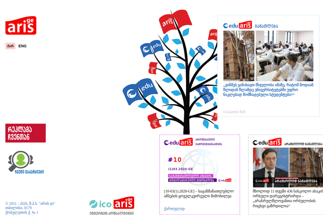 ჩვენ განათლების და განათლების გარეშემო თემებზე ვმუშაობთ, იხილეთ ჩვენი პროექტი განათლებაზე - edu.aris.ge, არამხოლოდ განათლებაზე - edu.aris.ge/amg, ასევე საგანმანათლებლო ამბების ყოველკვირეული მიმოხილვა პროფესიული გამოყენებისათვის ქართულ და ინგლისურ ენებზე - edu.aris.ge/zpro