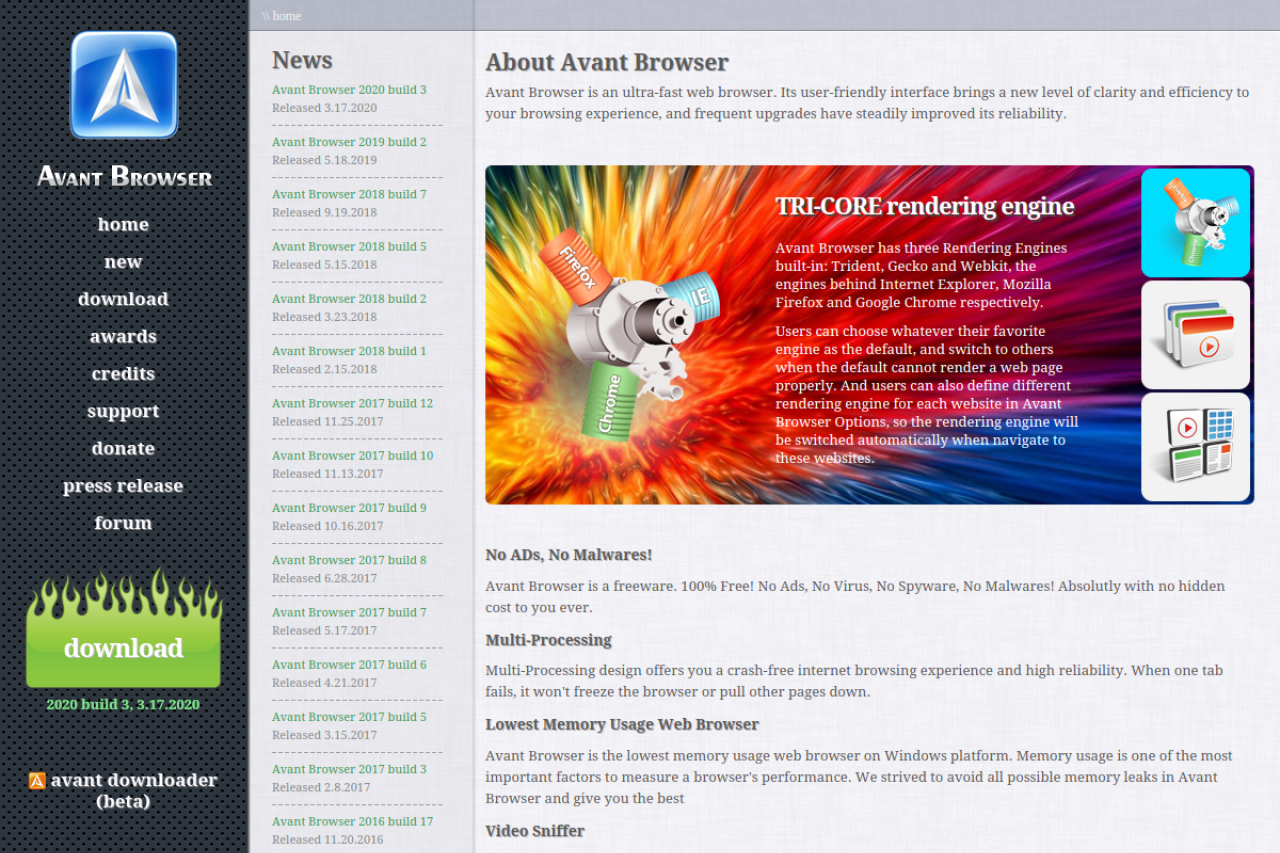 The full-featured tri-core rendering Avant Browser which supports IE/Firefox/Chrome engines is fast, stable and memory leak free.