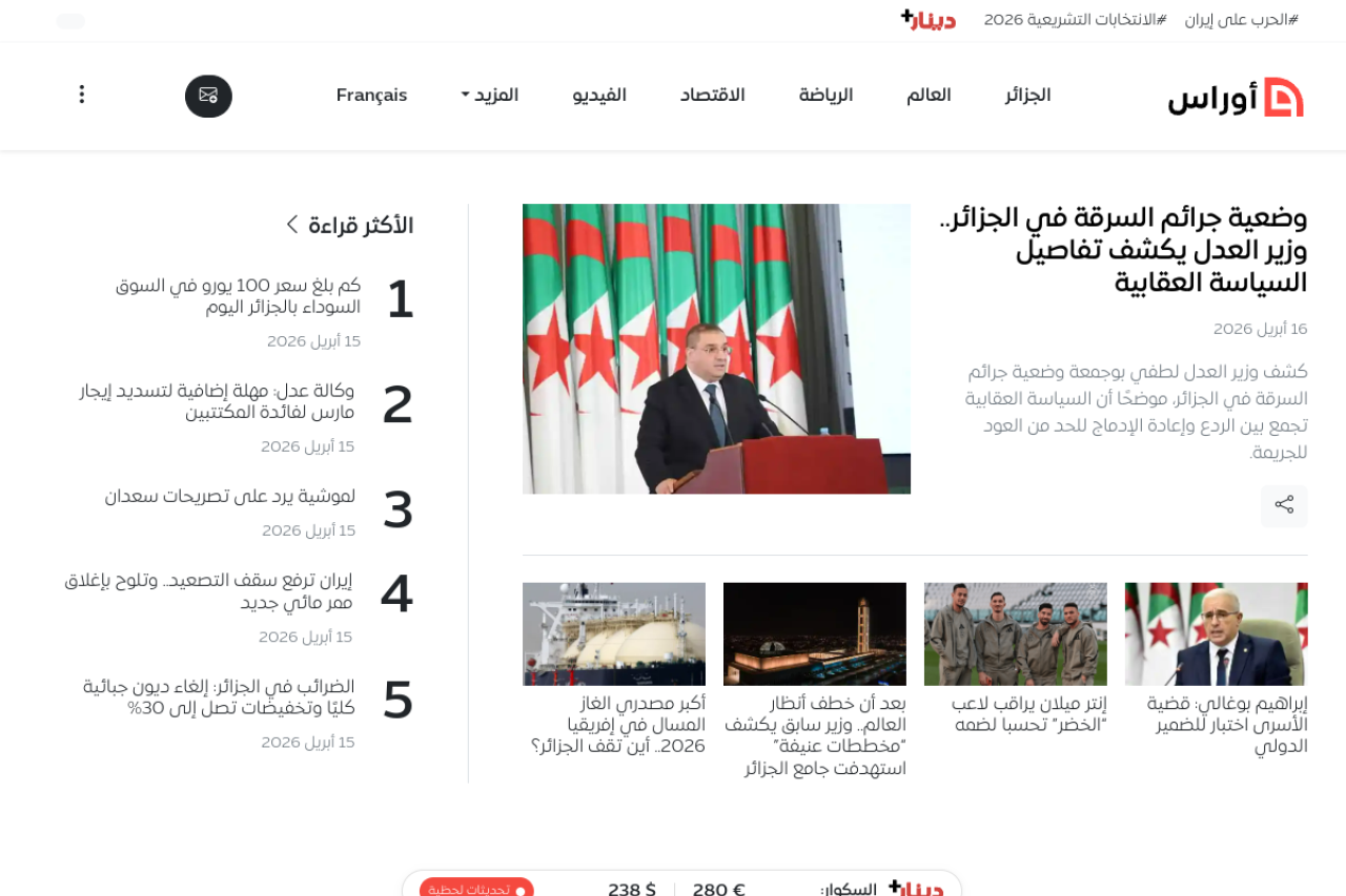 تعرف إلى آخر أخبار الجزائر لحظة وقوعها مع تحليلات ومقالات معمقة في السياسة والاقتصاد والاجتماع والرياضة