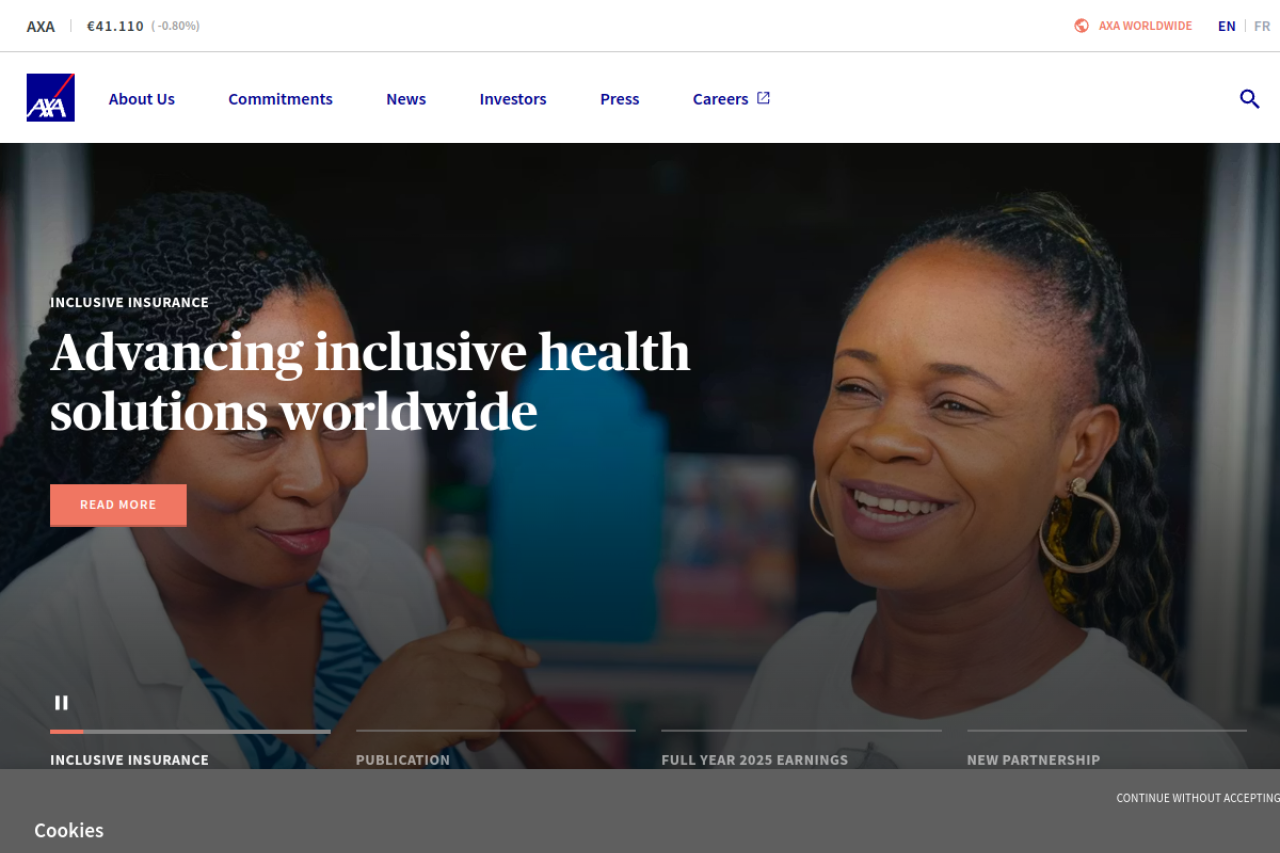 axa.com looks like insurance. Traffic signals point to roughly 369.0K monthly visits. Current AI trust scoring is 5/100.