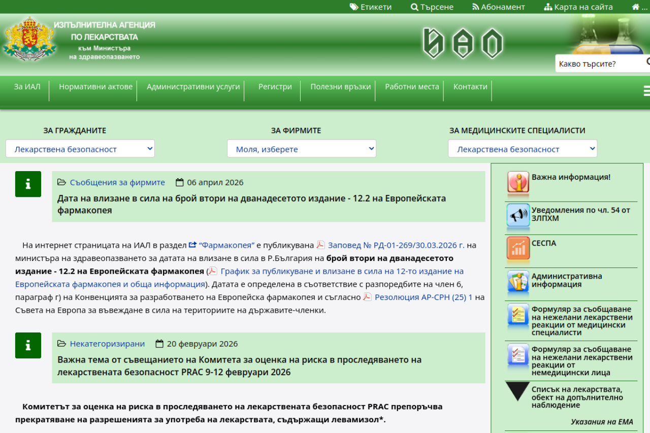 ИАЛ - Официална страница на Изпълнителната агенция по лекарствата към Министерството на Здравето на Република България