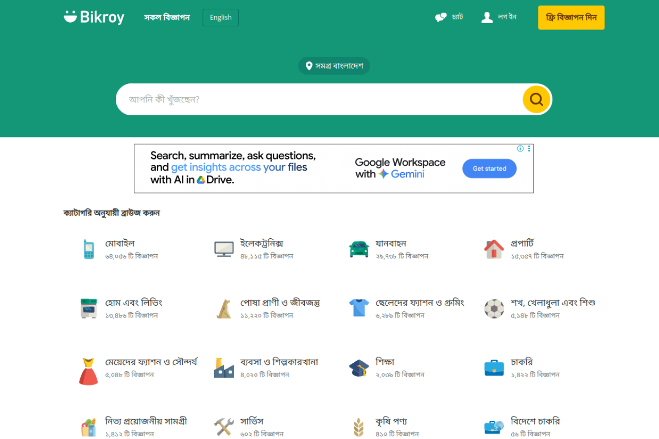 পুরনো গাড়ি থেকে শুরু করে মোবাইল ফোন, এমনকি নতুন বাসা পর্যন্ত সবকিছু কিনুন এবং বিক্রি করুন। ক্রেতাদের কাছে পৌঁছাতে ফ্রি বিজ্ঞাপন দিন, আশেপাশে সেরা ডিল খুঁজুন, বা সারা বাংলাদেশে অনুসন্ধান করুন।