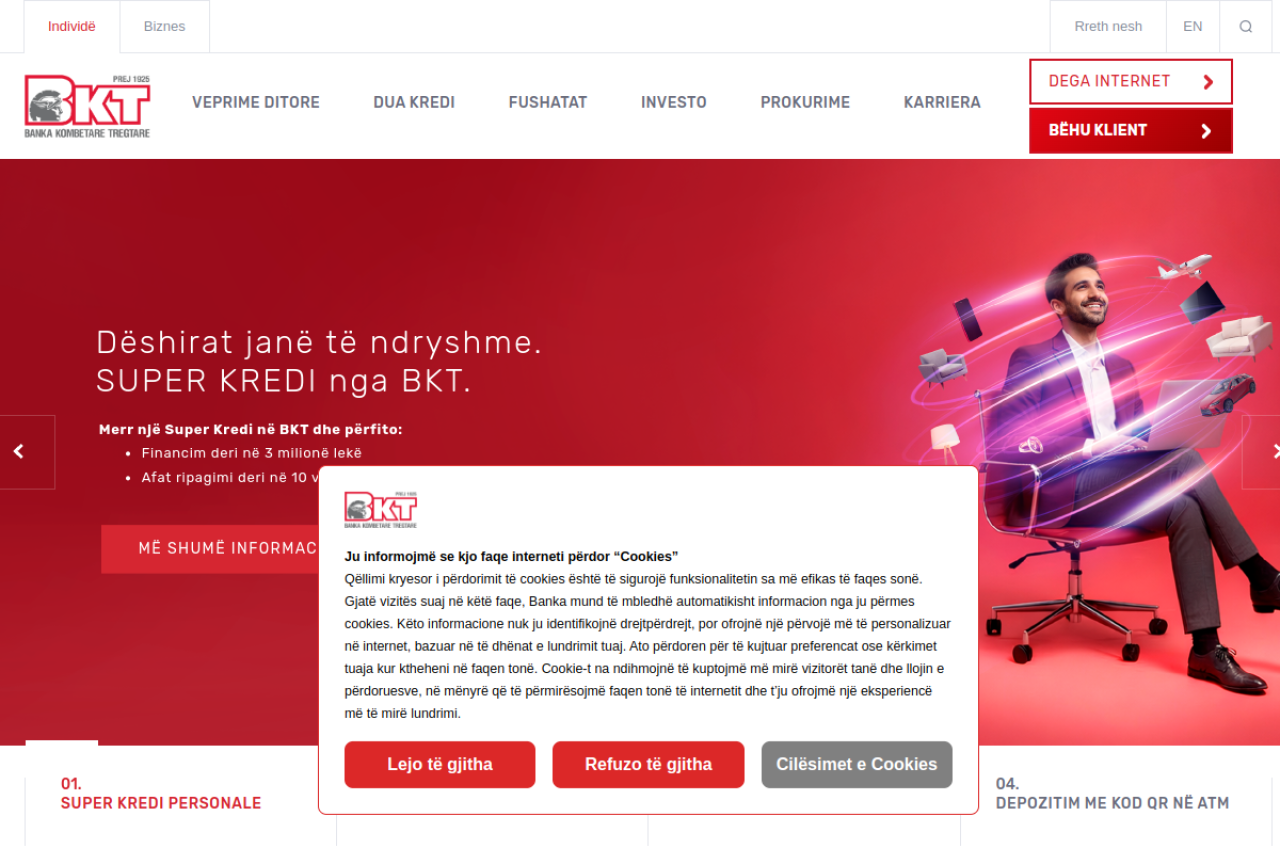Përfitoni nga shumëllojshmëria e ofertave nga BKT bank, përfshirë produktet bankare si, kredi per shtepi, kredi personale, depozita me norma të larta interesi, kartat e krediti, kembimi valutor…
