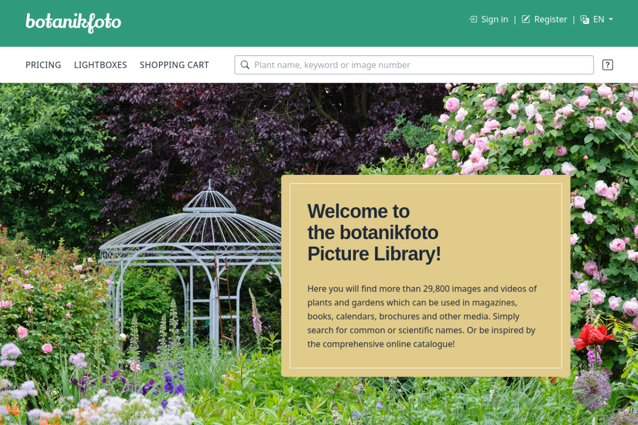 Photographs and videos of plants and gardens for use in magazines, books, calendars, brochures and other media
