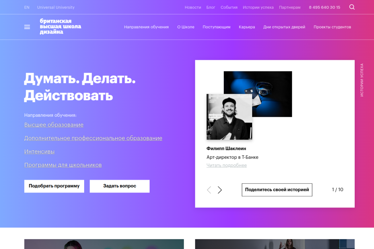 Британская высшая школа дизайна готовит специалистов для креативных индустрий по направлениям: графический дизайн, UX/UI дизайн, дизайн интерьера, дизайн одежды, маркетинг и современное искусство.