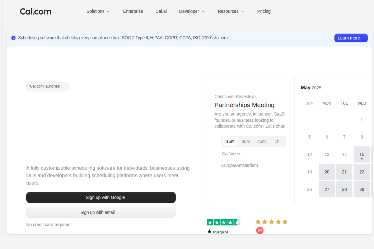 A fully customizable scheduling software for individuals, businesses taking calls and developers building scheduling platforms where users meet users.