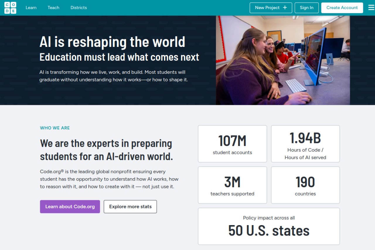 Bring computer science and AI education to your classroom with Code.org’s free K–12 curriculum, hands-on projects, and teacher professional development—no prior experience needed.