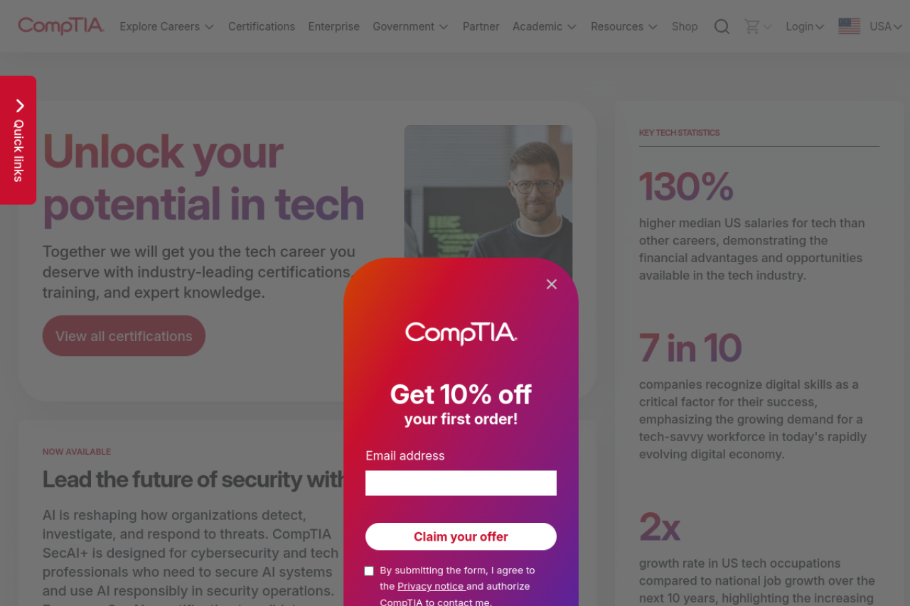comptia.org looks like technology & computing. Traffic estimates are limited, so use the trust and structure modules first. Current AI trust scoring is 5/100.