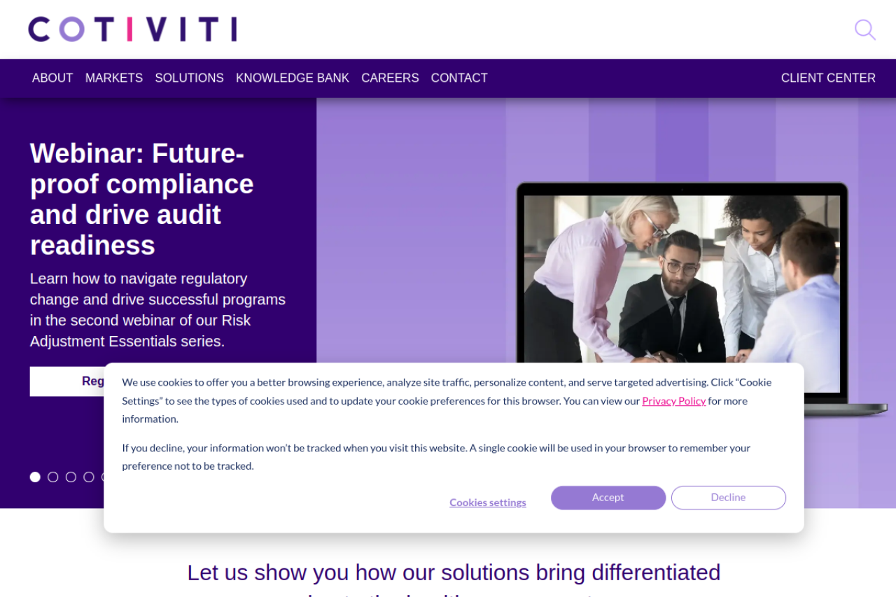 Cotiviti is a solutions and analytics company leveraging unparalleled clinical and financial datasets to deliver insight into the healthcare system’s performance.