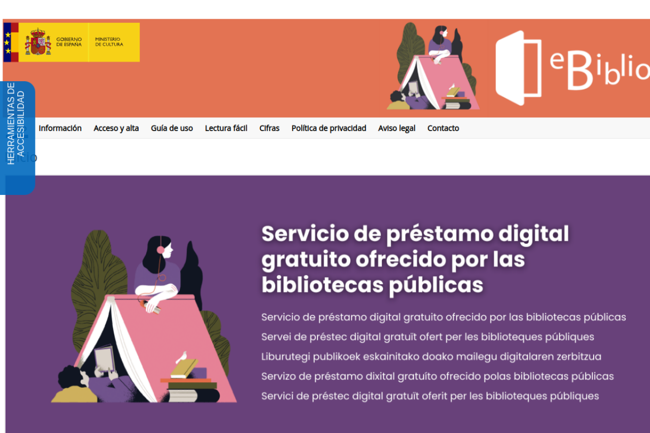 Web del servicio eBiblio, servicio de préstamo gratuito de libros electrónicos, audiolibros, revistas y periódicos, de las bibliotecas públicas.