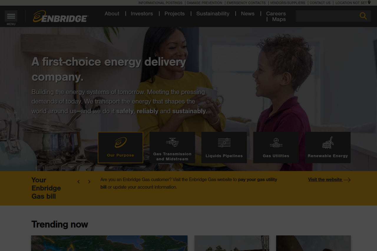 Enbridge is North America’s premier energy delivery company, operating four core businesses—liquids pipelines, natural gas pipelines, gas utilities and storage, and renewable power. As a diversified energy company, we are uniquely positioned to help accelerate the global energy transition, and we’re doing it in ways that are ethical, sustainable and socially responsible. We’re also advancing new low-carbon energy technologies—including renewable natural gas, and carbon capture and storage.