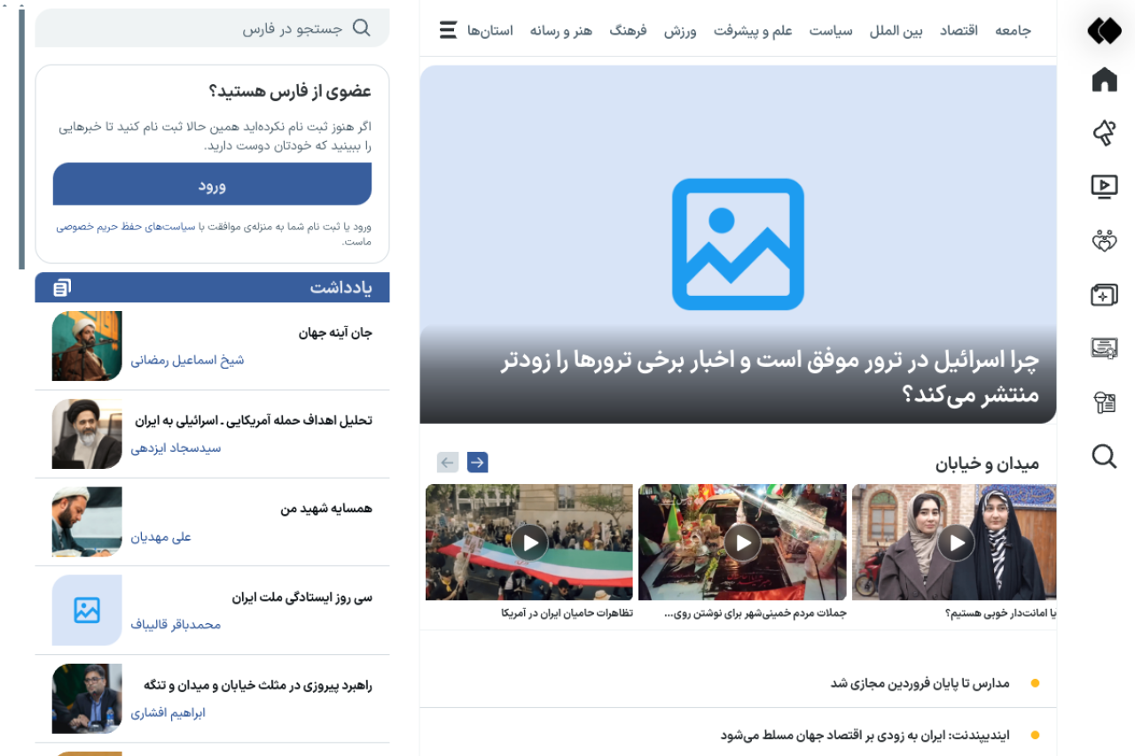 آخرین و مهمترین اخبار ایران و جهان را در خبرگزاری فارس بخوانید. خبرگزاری فارس، پربازدیدترین خبرگزاری کشور و معتبرترین مرجع خبری رسانههای ایران و جهان.