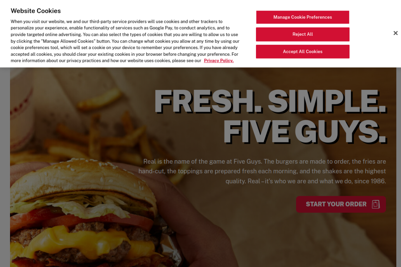 Hand-cut fries, made-to-order burgers, and creamy shakes. Order online or find a Five Guys near you. Real ingredients. Real flavor.