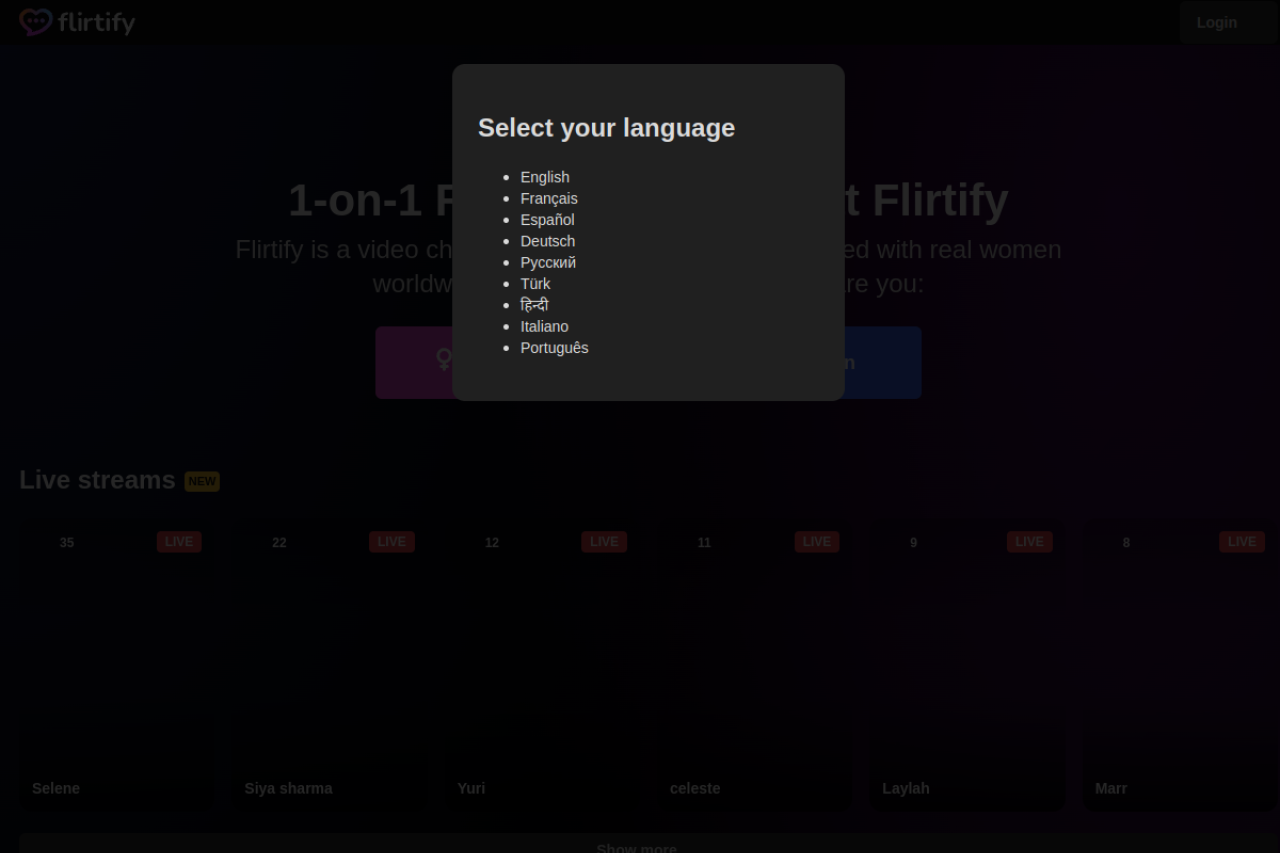 Flirtify is a live 1-on-1 video chat roulette where men meet women in Omegle style. Find a beautiful girl worldwide and communicate with any random stranger thanks to our real-time translation in any language. Join for free!