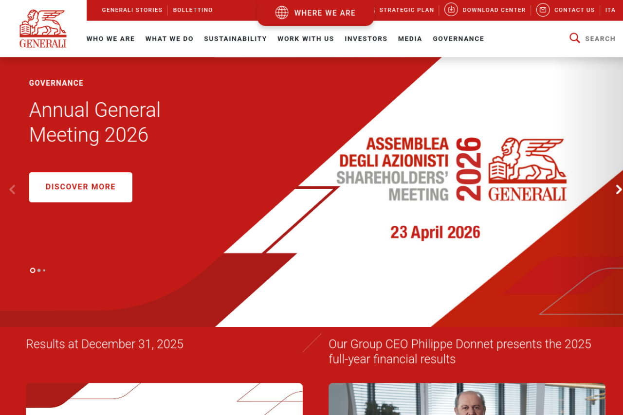 Visit the corporate website of Assicurazioni Generali Group: you can find, in addition to the storytelling on topics of general interest, information about our activities, financial data, news, CSR, career opportunities, and history.