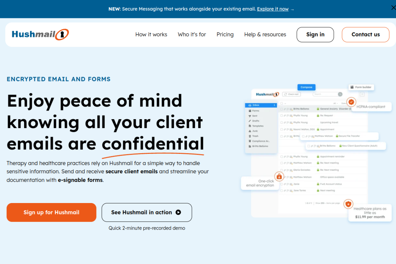 Send secure emails and forms with Hushmail. Trusted by therapy and healthcare practitioners for handling sensitive information.