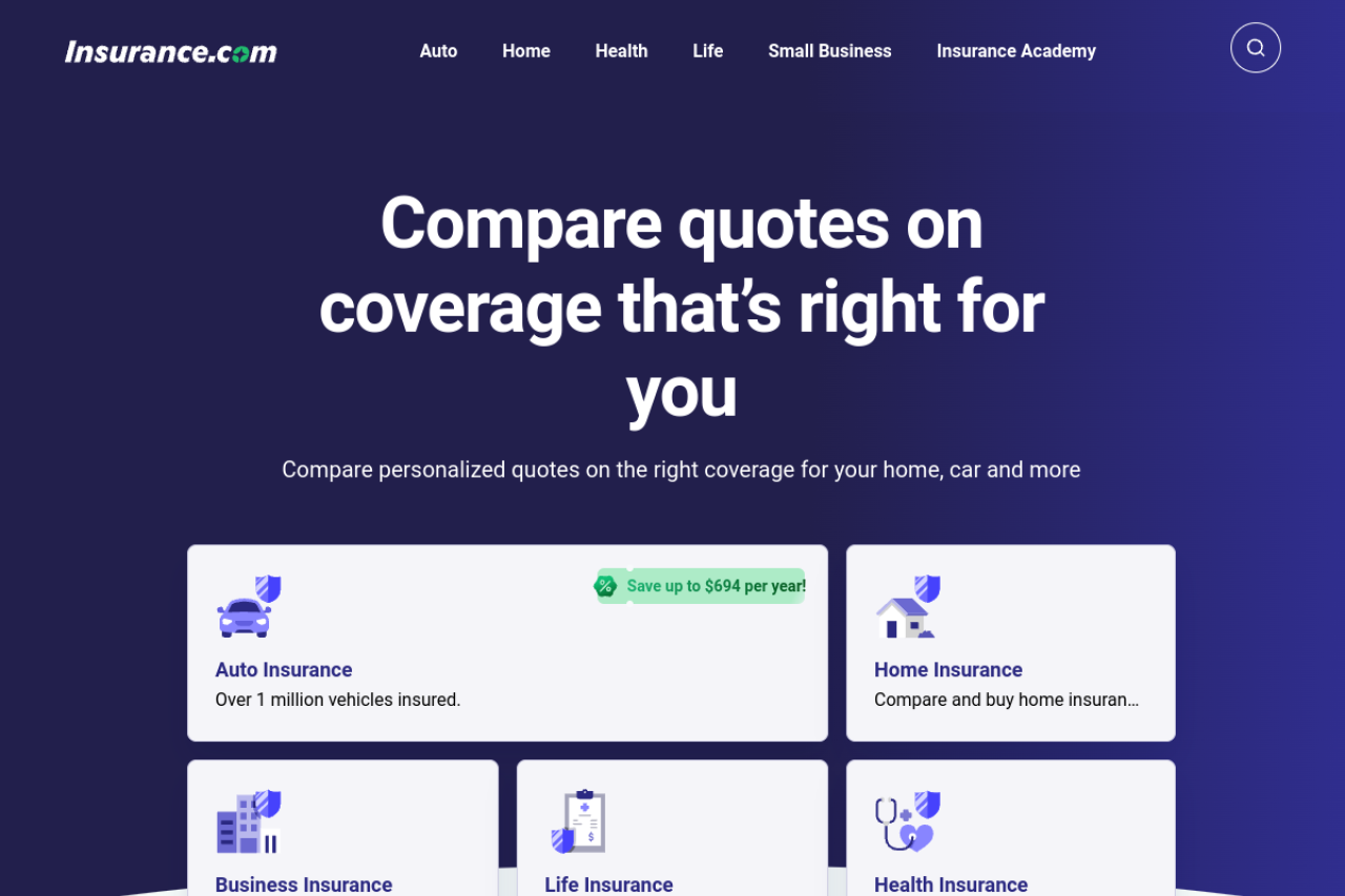 insurance.com looks like personal finance. Traffic estimates are limited, so use the trust and structure modules first. Current AI trust scoring is 10/100.