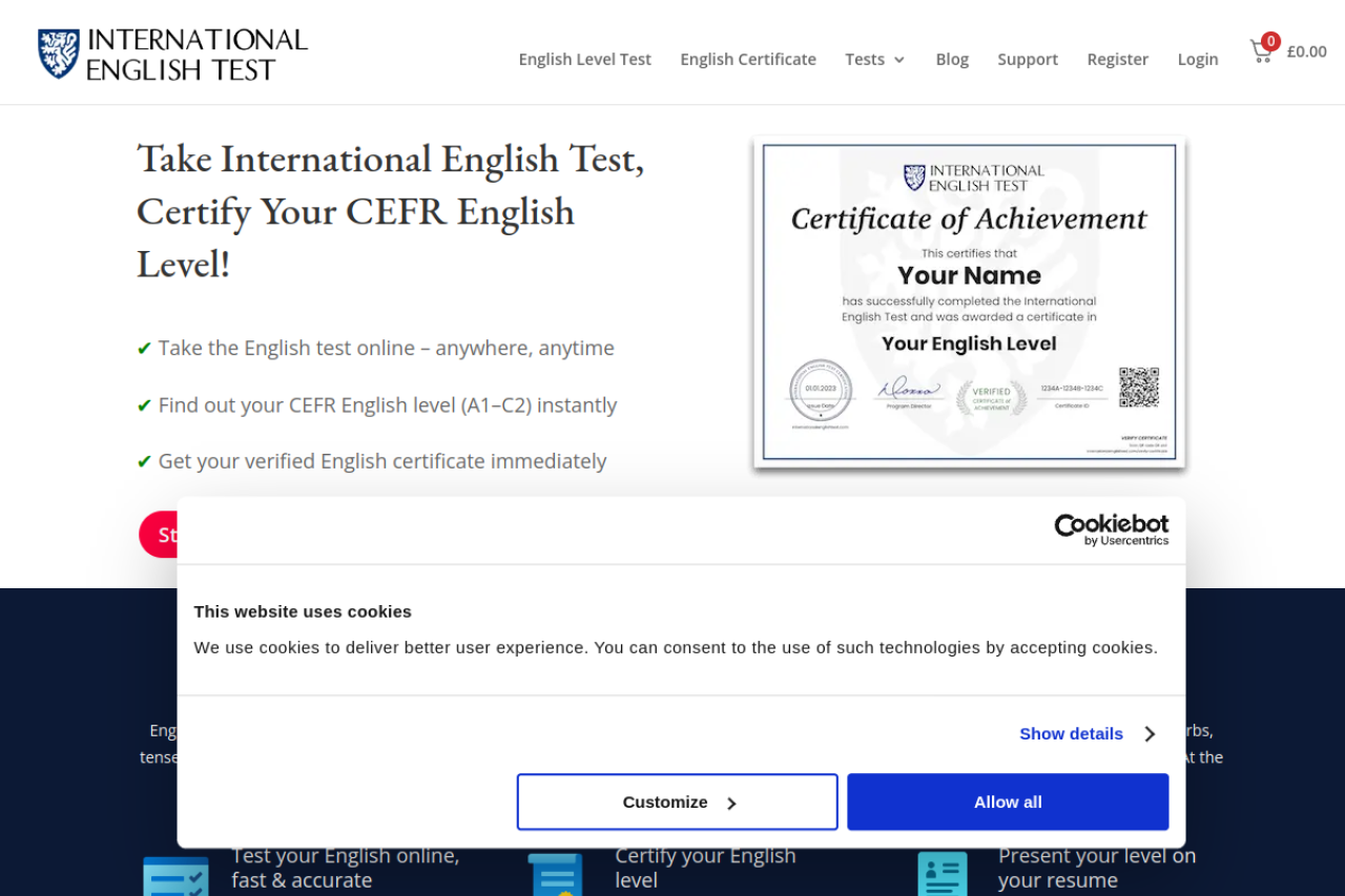 Test your English level online with International English Test. Discover your CEFR level A1–C2 and get a verified certificate accepted worldwide.