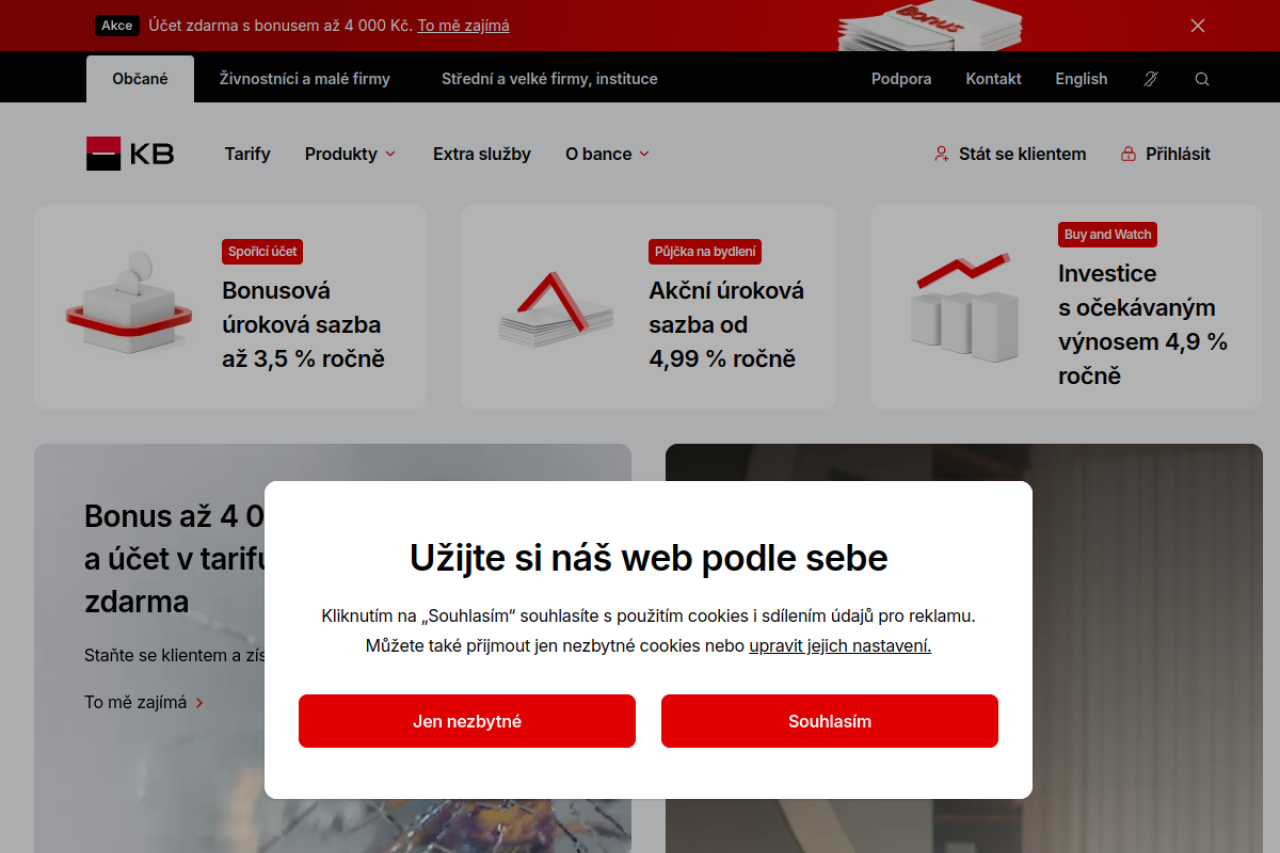 Komerční banka poskytuje finanční produkty a služby pro občany, podnikatele, malé i velké podniky a státní správu. Bankovní účty, půjčky, hypotéky, spoření, investice, pojištění. Široká síť poboček a bankomatů KB.