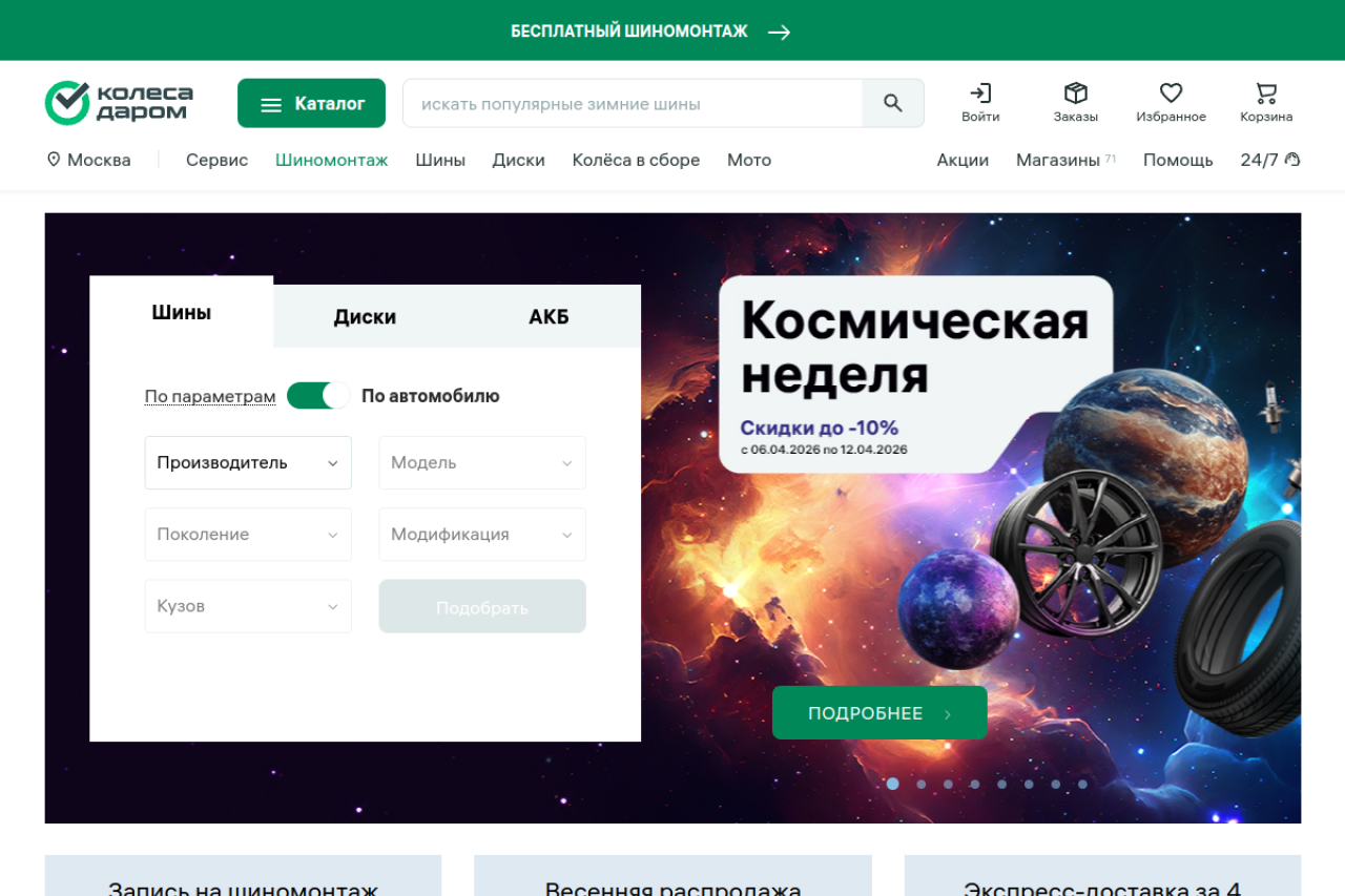 «Колеса Даром» — интернет-магазин шин, дисков и автотоваров в Москве с бесплатной доставкой