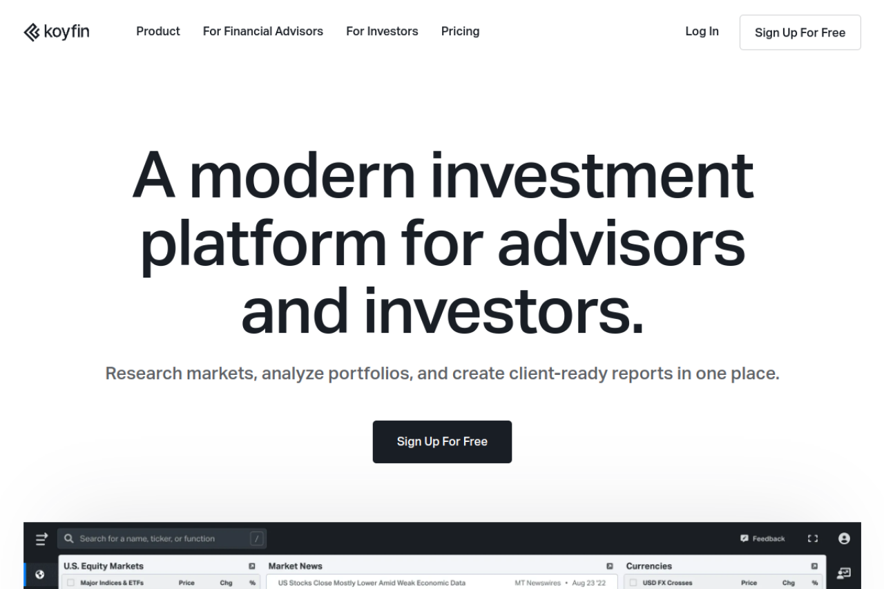 Koyfin provides tools for advisors and investors to research markets, analyze portfolios, and create client-ready reports in one place. Koyfin covers equities, ETFs, mutual funds, forex, bonds, etc.