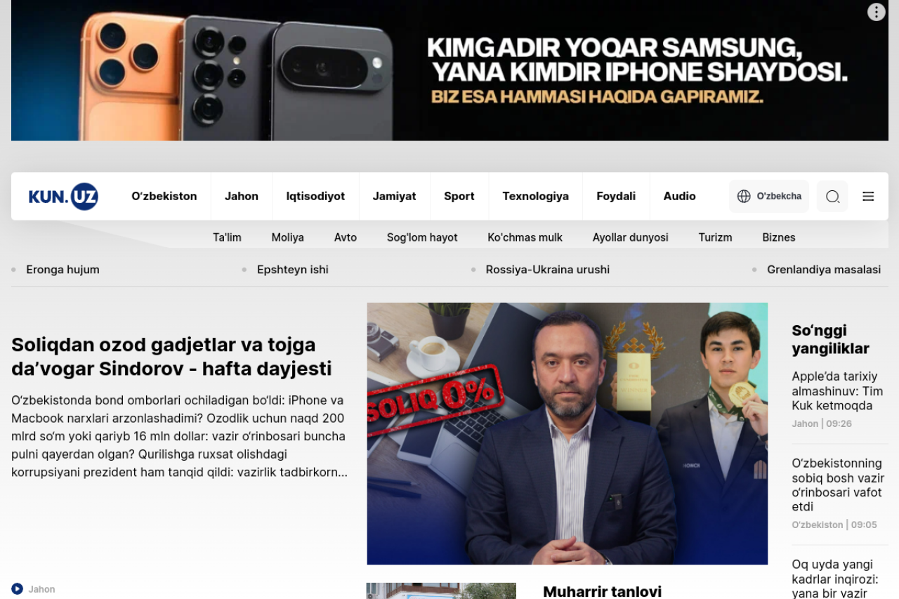 O‘zbekistonda va dunyoda ro‘y berayotgan eng so‘nggi yangiliklar va xabarlar, jamiyat, iqtisodiyot, madaniyat, sport, tenologiyalarga oid qiziqarli maqolalar. Mashhurlar bilan intervyular, barchasi KUN.UZ saytida.