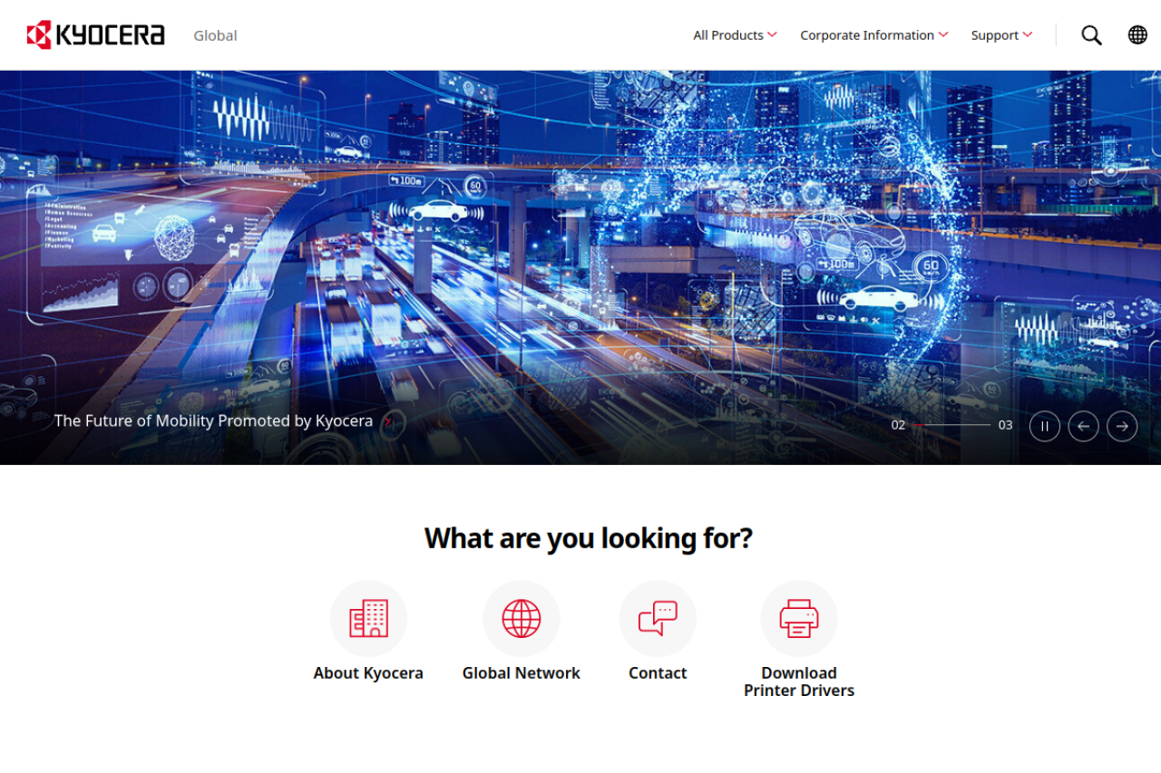KYOCERA Corporation is a diversified manufacturing company that engineers products and solutions in various fields, including fine ceramics, semiconductor components, electronic components, telecommunications, energy solutions, and more. Company/Products/IR/Career information.